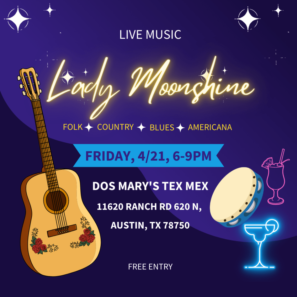 Lady Moonshine will be playing at Dos Mary’s Tex Mex Restaurant on Friday April 21st 2023 from 6-9pm.